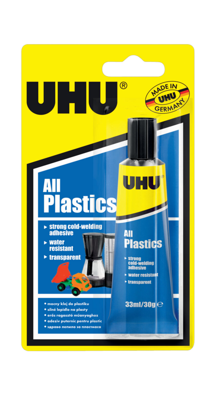 • attained after 5 - 10 minutes. The high bond strength of UHU allplast on plastics is attained by slightly dissolving the surface of the plastic material. For this reason, the adhesive should only be applied in small quantities on low caliper plastics.