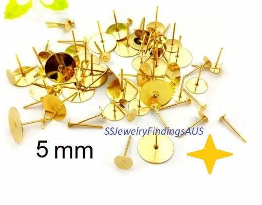 10 Pairs Stainless Steel Gold Vacuum Plated 5mm Pad Earring Studs with Tension Locking nuts Hypoallergenic