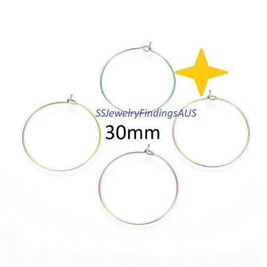 2 Pairs Stainless Steel Anodized and Plated 30mm Wire Hoop Earring 22 Gauge Hypoallergenic Tarnish Resistant