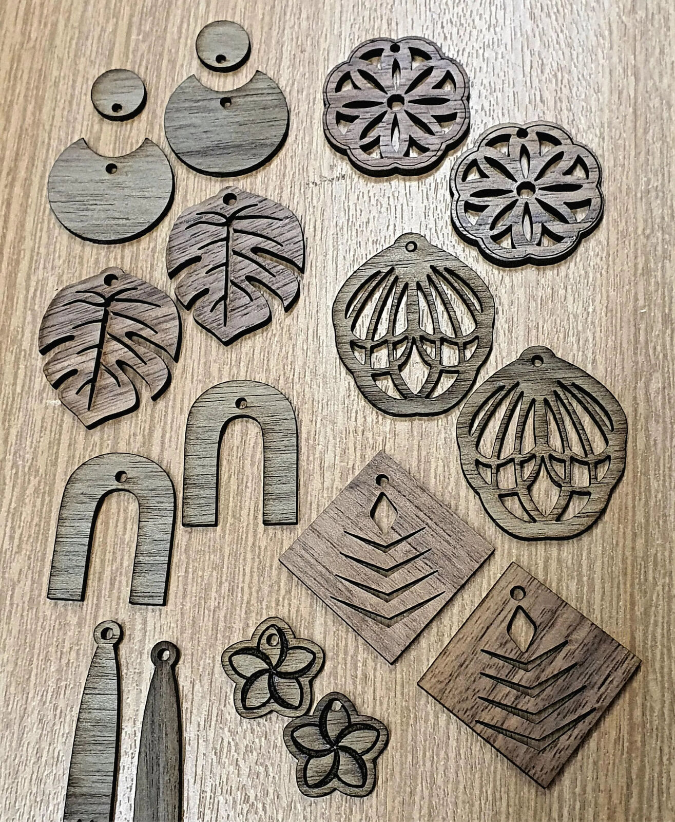 - Includes 18 laser-cut earring pendants in cherry and walnut wood, ranging from 12mm to 40mm